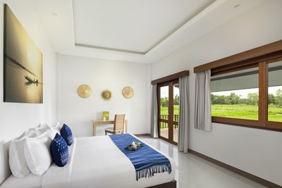 This comfortable villa with generous balcony is overlooking organic rice paddies. The villa offers air-conditioning, bathroom with a special view outside and a large shower.